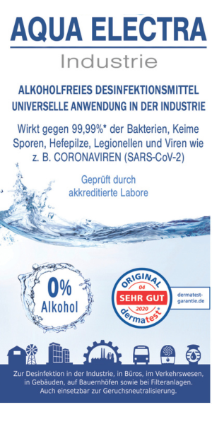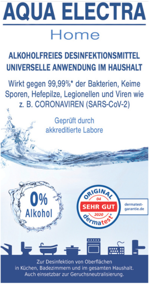Das Produkt wird durch modernste Elektrolysetechnologie aus Wasser und Salz hergestellt. Jeder Produktionsschritt wird streng überwacht und durch akkreditierte deutsche Laboratorien getestet. Die Wirksamkeit wird regelmäßig durch unabhängige Institute bestätigt.
